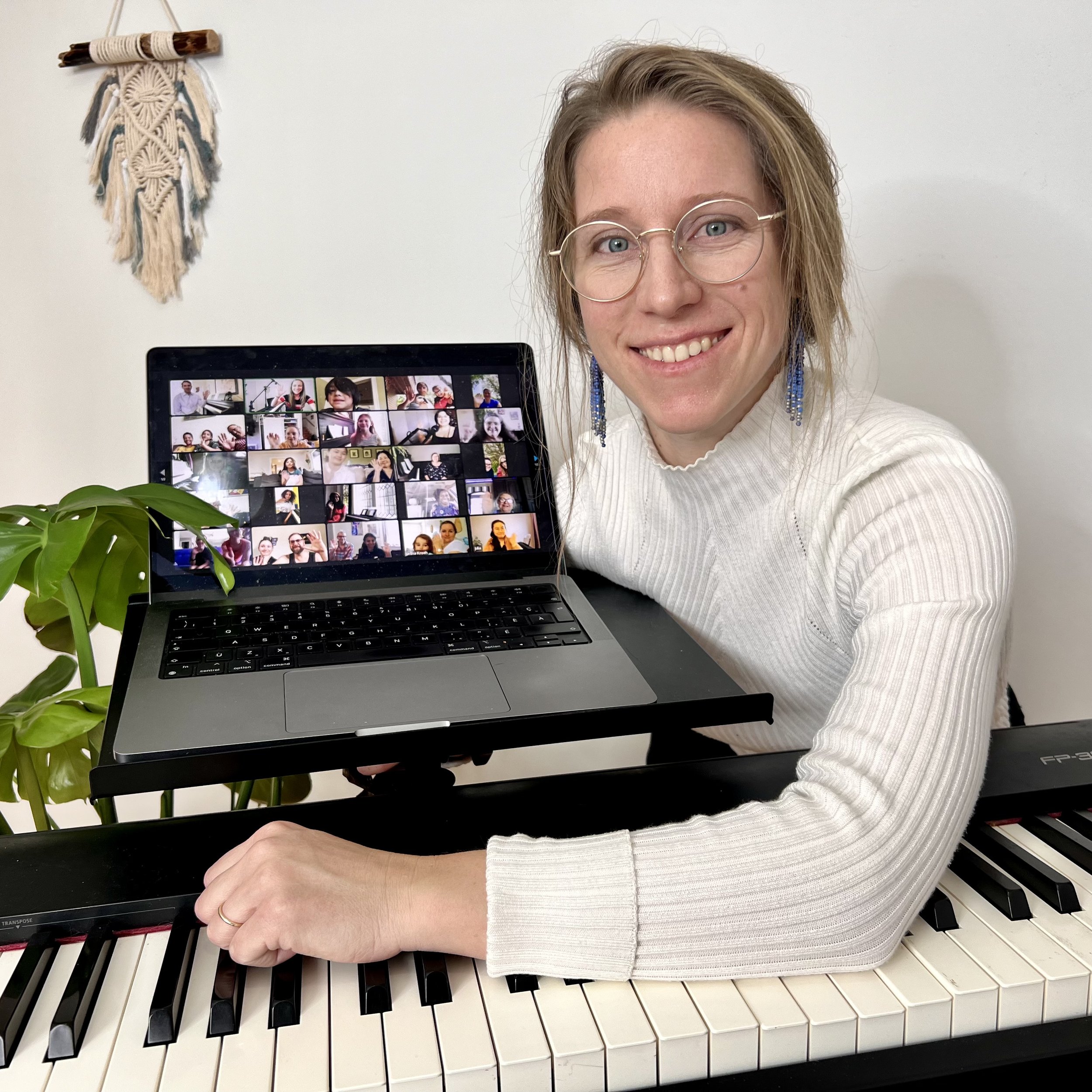 No. You just need a good internet connection, a device with a camera and microphone, and a piano or keyboard. Everything else is kept simple so the focus stays on playing, not technology.