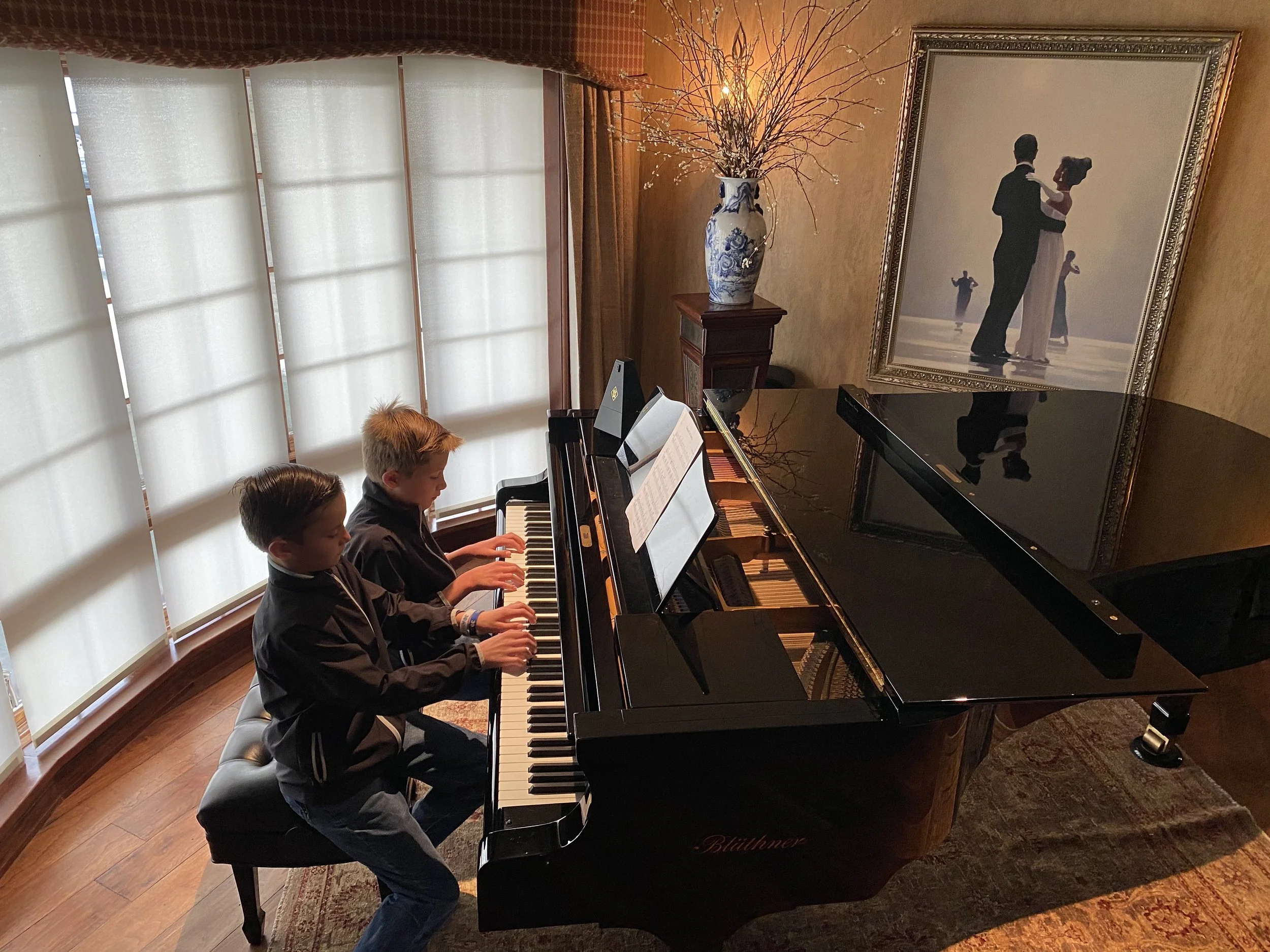 An acoustic piano or 88-key weighted digital piano, a device with a camera and microphone (laptop, tablet, or phone), and a stable internet connection. Becky will walk you through the rest during setup.